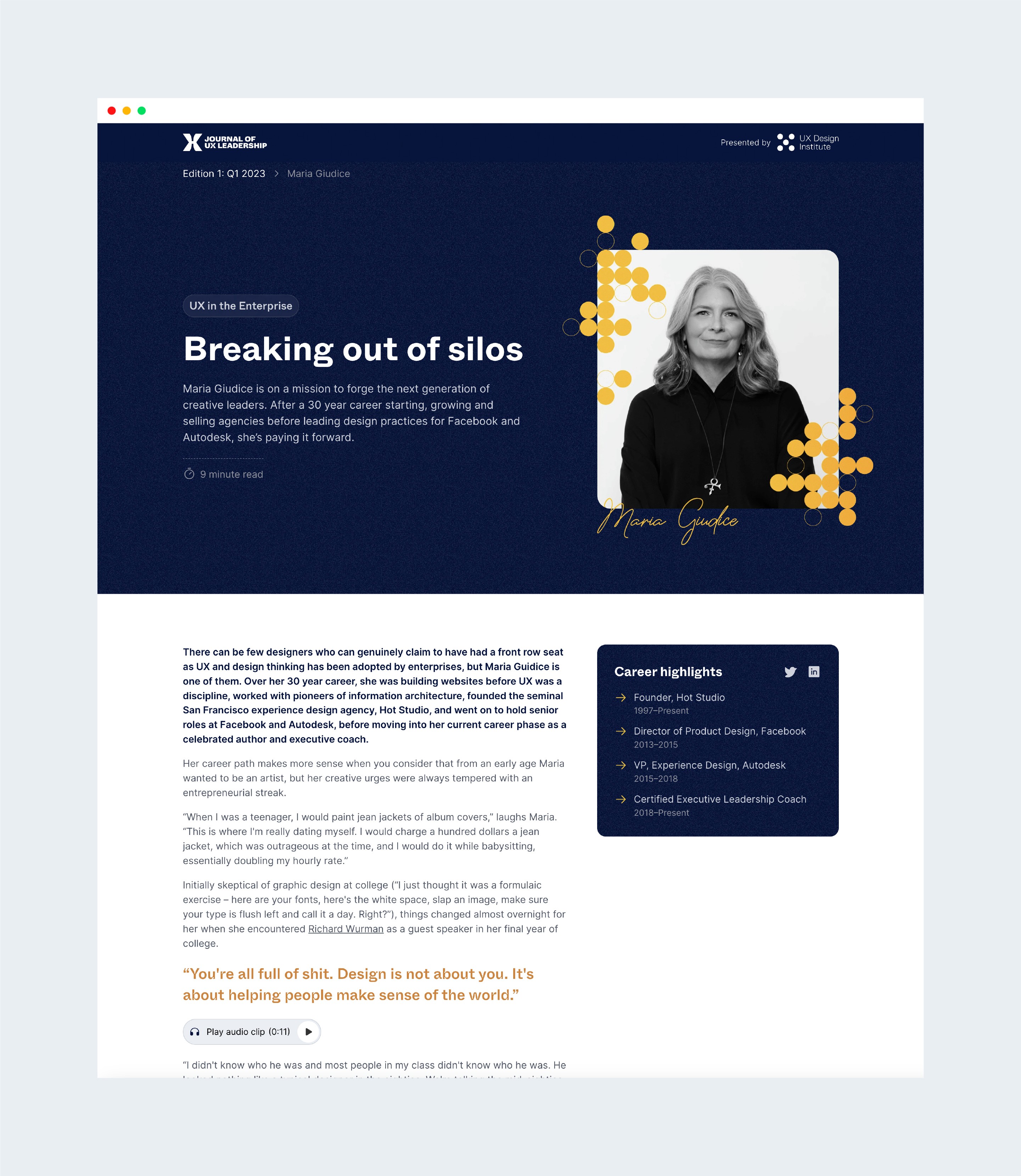The Journal of UX Leadership serves as a platform for ambitious UX professionals eager to learn from peers and advance their careers, showcasing insightful interviews with prominent UX leaders worldwide.