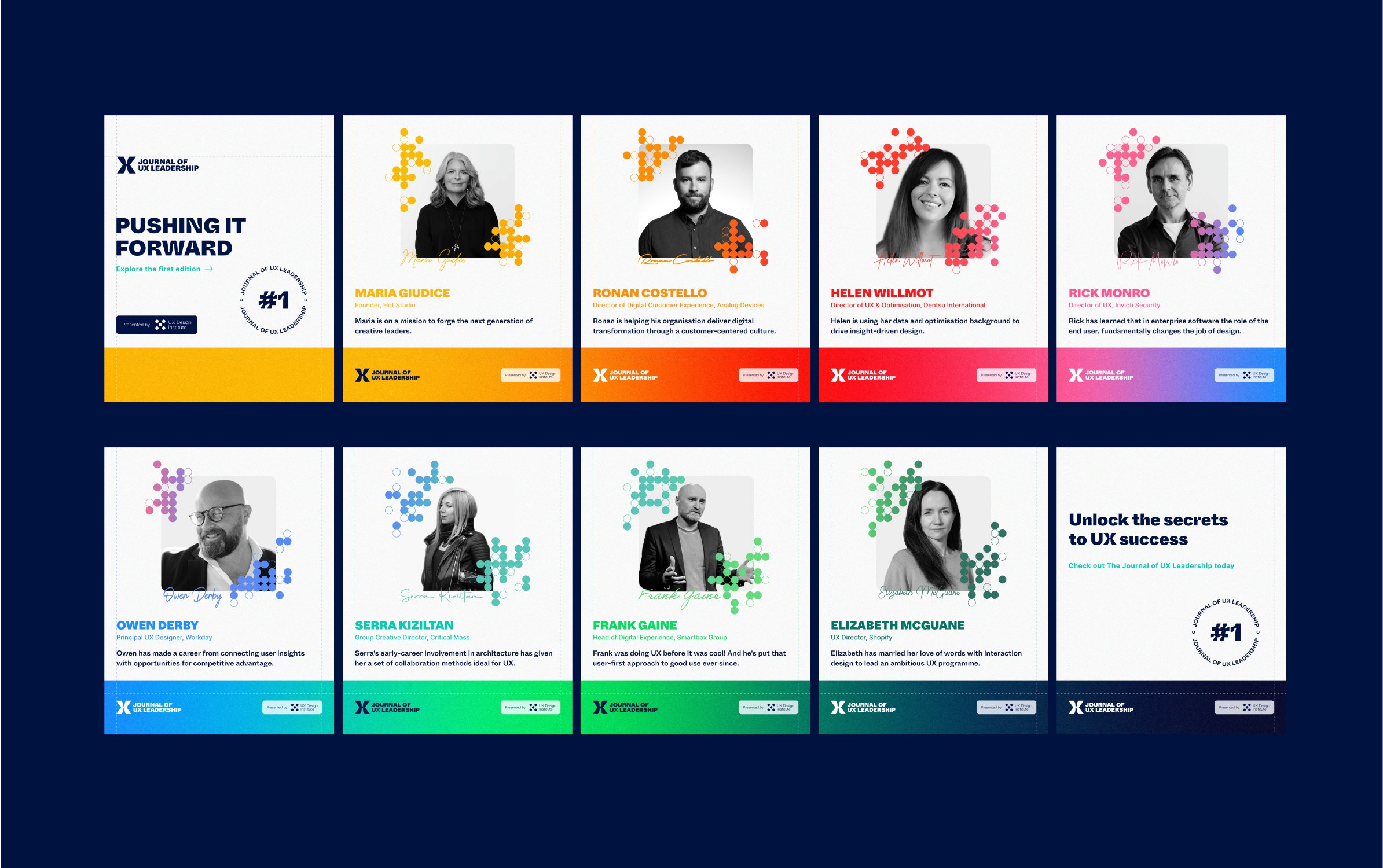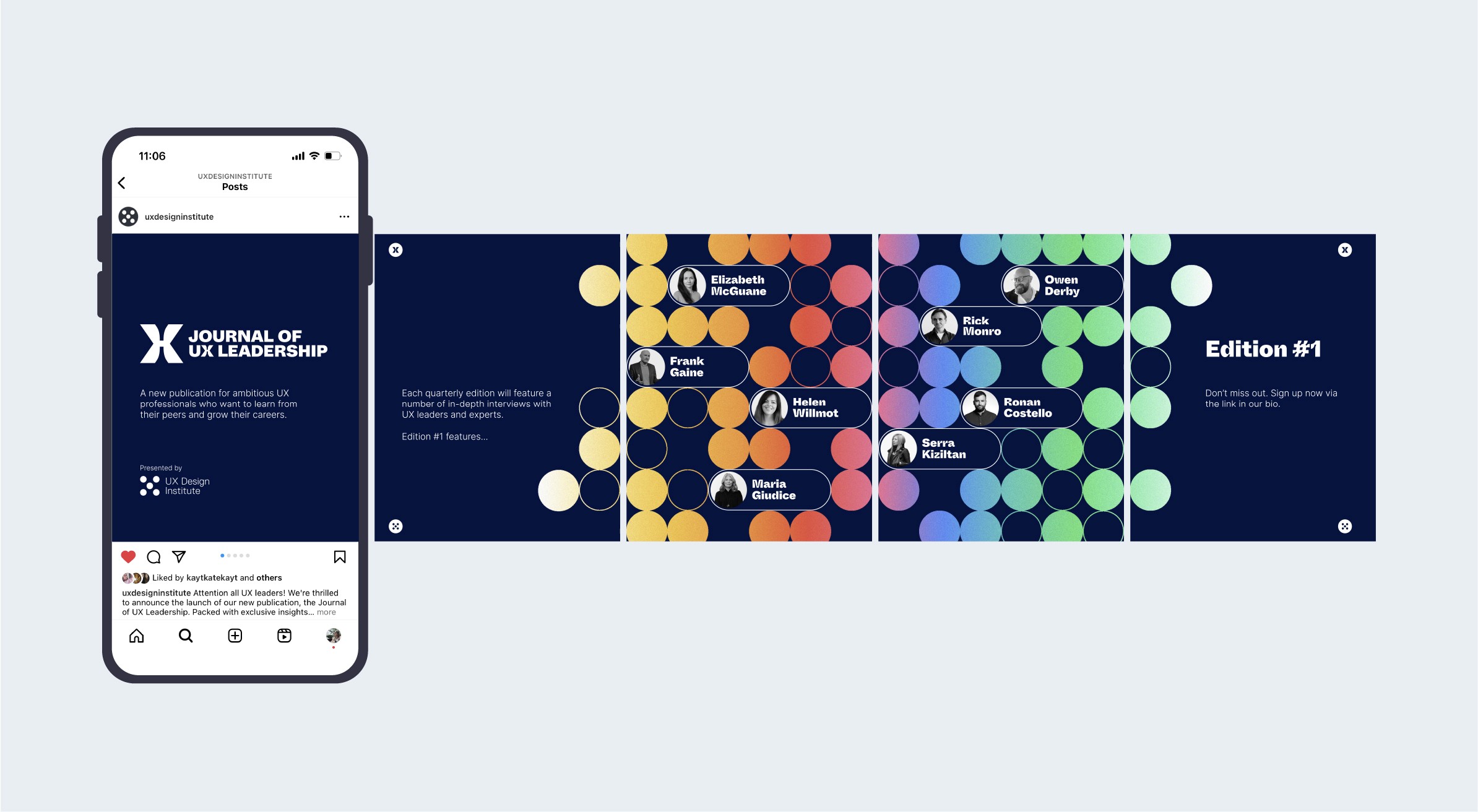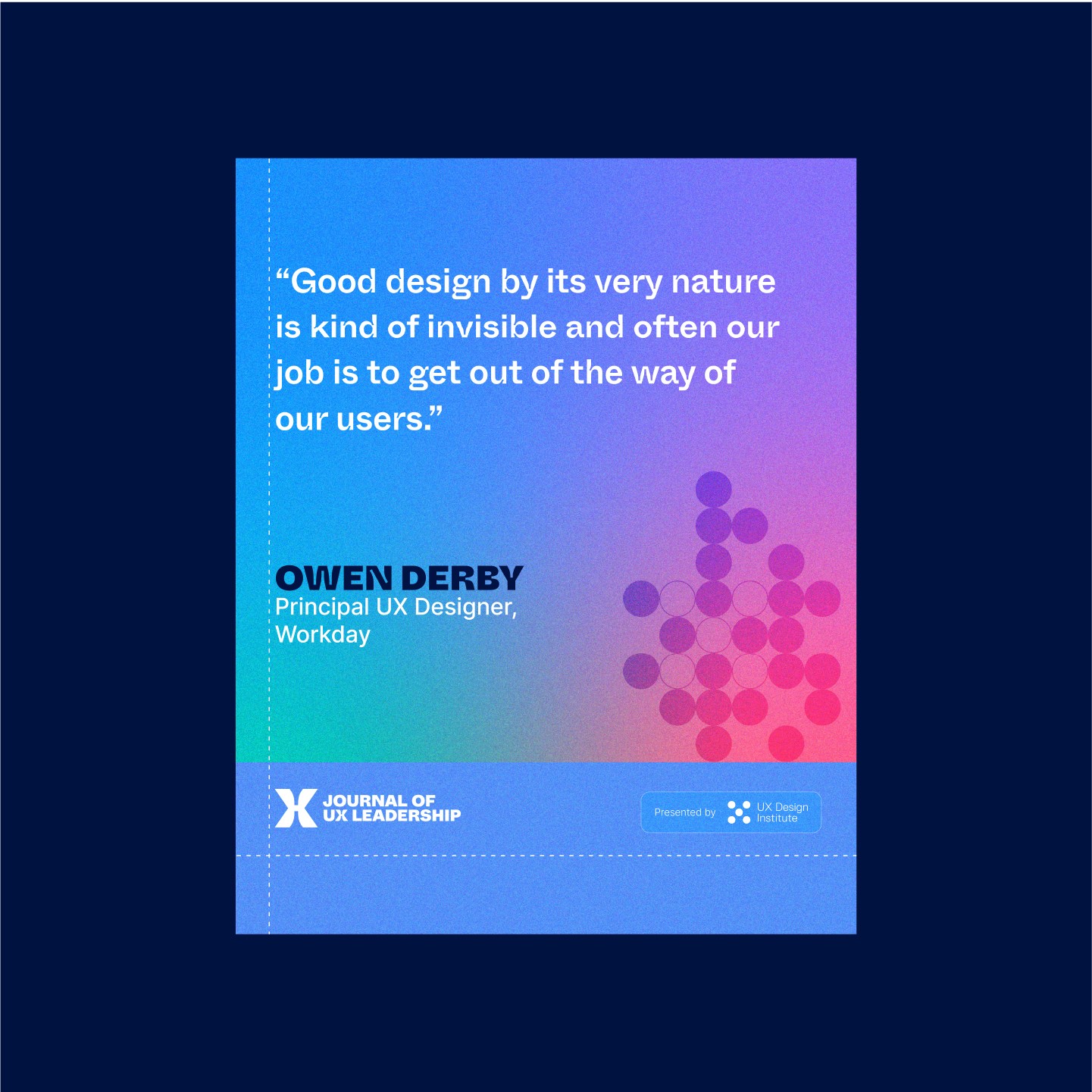 I, along with two others, was tasked with crafting a distinctive brand identity while still maintaining a link to the UX Design Institute's brand. We achieved this by using UXDI's colour palette as a base when exploring swatches for the Journal. I also created a dot pattern derived from UXDI's quincunx logo.